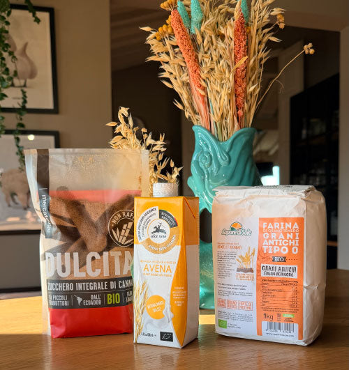 Un kit semplice ma indispensabile, con gli ingredienti fondamentali per preparare ogni torta. Con la Box Ricetta – Kit base per torte hai a disposizione una farina di qualità, un latte vegetale biologico e uno zucchero integrale da filiera etica: tre elementi che non possono mancare quando si vuole sfornare un dolce soffice, genuino e versatile. Abbiamo selezionato prodotti che si sposano alla perfezione, così tu puoi aggiungere pochi ingredienti freschi (come uova, olio o frutta) e personalizzare la ricetta secondo i tuoi gusti.